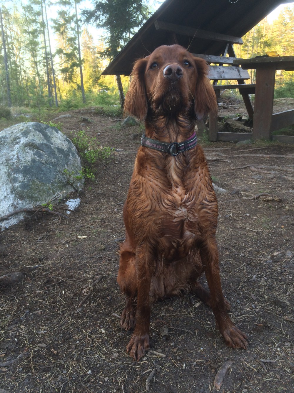 Nå vet den at den skal sitte der til den hører ordet apport. Det betyr visst nok, å hente. Hunden løper det den orker, men den finner ikke tingen. Hunden setter så nesa i bakken og snuser rundt. Og vipps så er tingen der. Hunden tar tingen i munnen og løper mot sjefen. Den vet at det er sjefen som skal ha den. «Takk takk.» Hunden slipper så tingen i hendene på sjefen. Så får hunden mye ros. Det er det beste den vet.