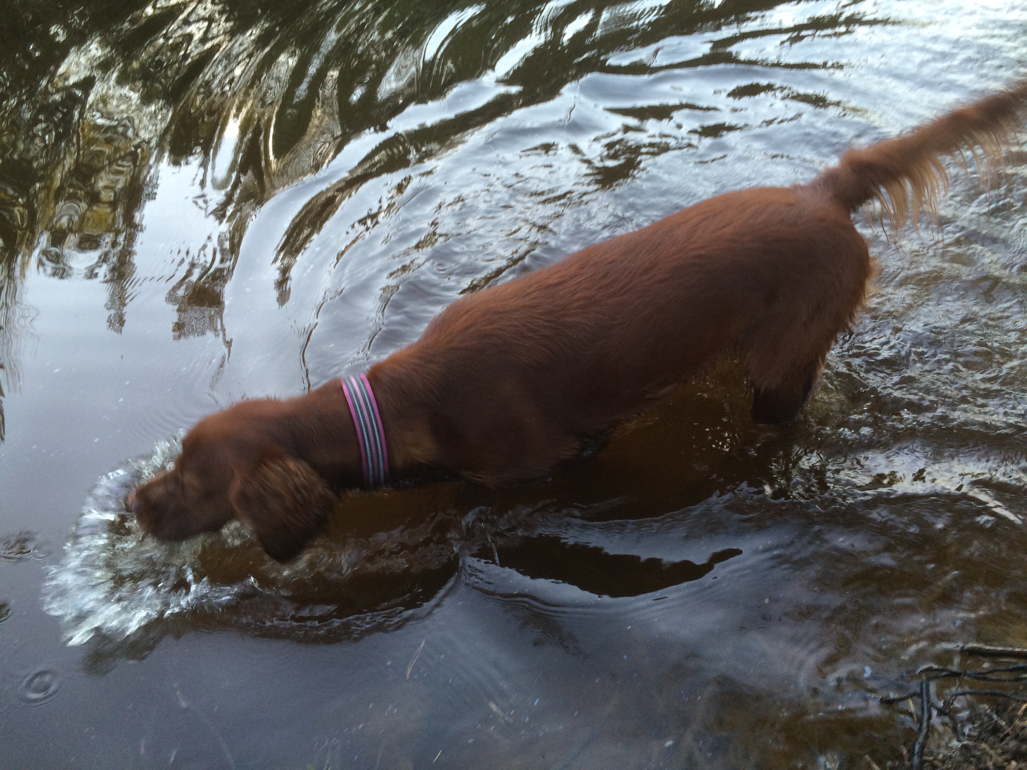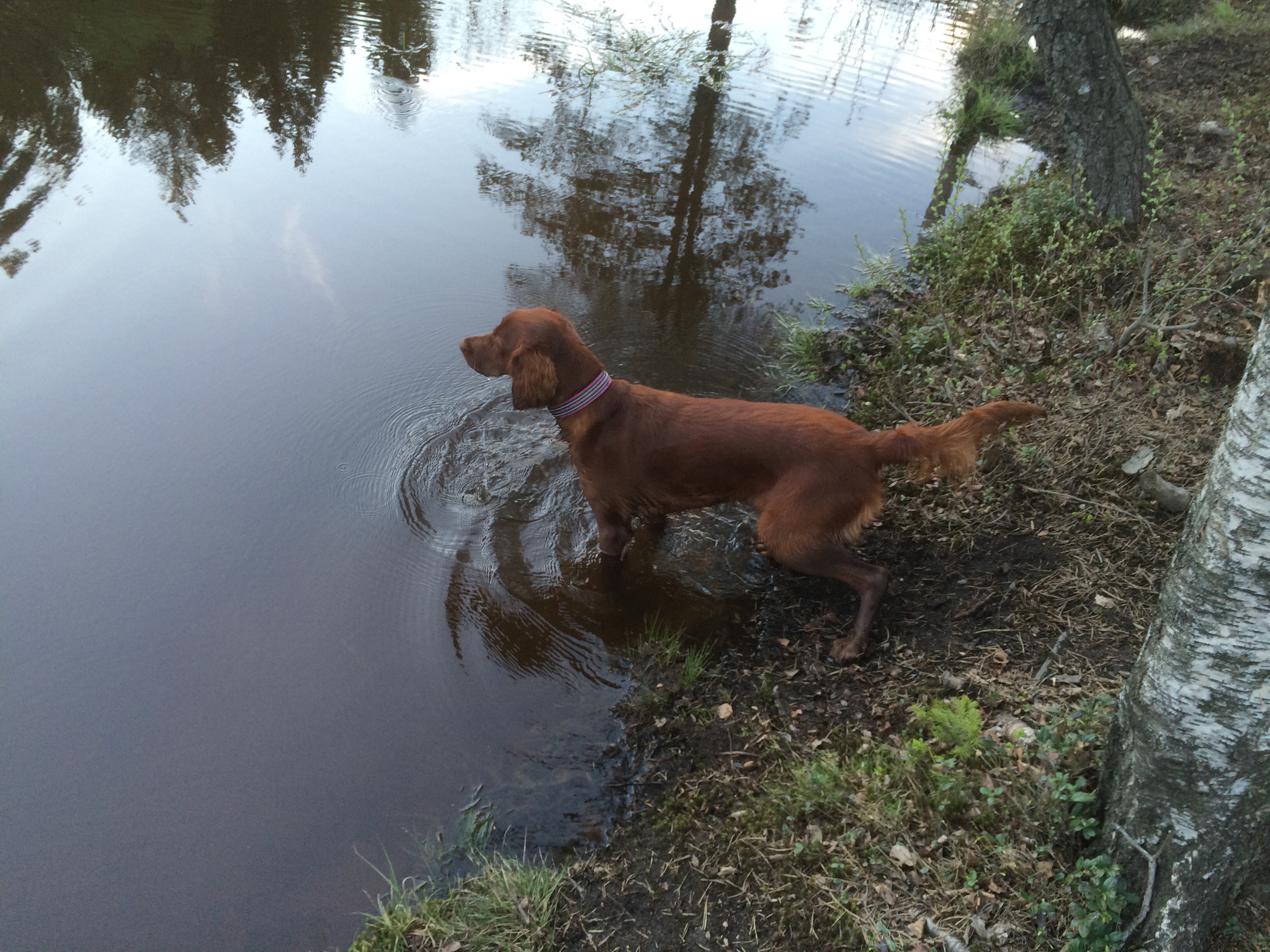 Sola steker godt på himmelen. Da er det godt at det er en dam å bade i. Hunden tørr ikke å gå helt ut på dypet. Men snart kan den hente ting langt der ute også. Akkurat som de andre tøffe hundene. Sjefen har fortalt hunden, at det kan være fugl den skal hente en dag. Og da er det lurt å trene!!