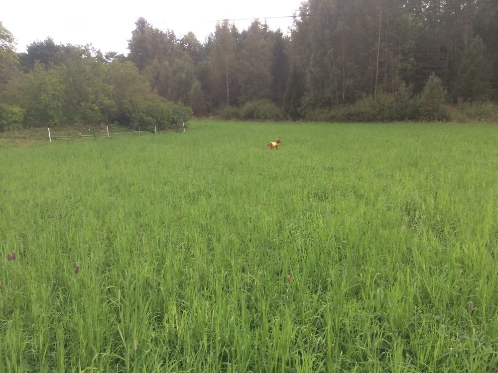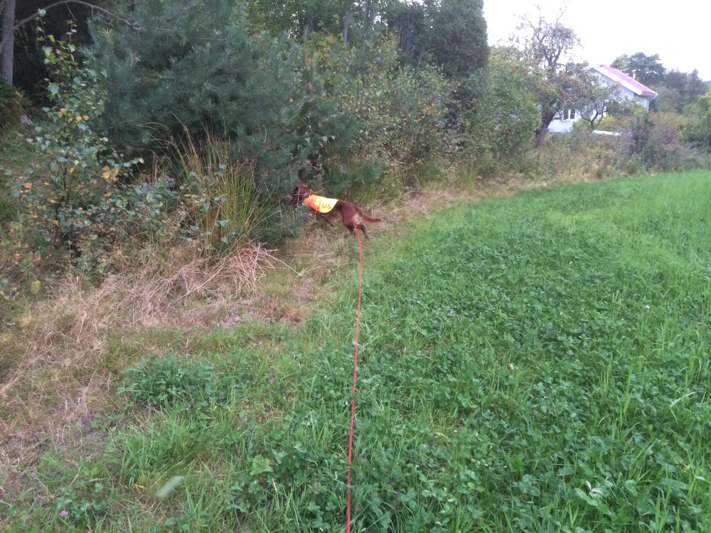 I dag tok Stella og jeg turen ut i havgapet, nærmere bestemt til Kirkøy i Hvaler kommune. Jeg hadde nemlig fått en SMS fra en som heter Torgrim Tomta. Han informerte om at han hadde fasan og rapphøns klare for trening. I løpet av timen vi var der kom vi over 3 rapphøner og 2 fasaner. Uheldigvis var det helt vindstille da vi var der, og dermed var det vanskelig for Stella. Det endte med at Stella støkket rapphønene. Da foreslo Torgrim å hente ett par fasaner som han satte ut. Dette fordi de løper bedre på bakken og ville dermed avgi bedre lukt. Den første fasanen ble støkket, heldigvis hadde jeg på langline slik at jeg holdt henne igjen. Stella våknet plutselig veldig og skjønte hva dette med fasaner dreide seg om. Brått så søkte hun seg bra gjennom det lille terrenget som var, og festet etterhvert en fast stand. Jeg gikk opp til henne og ba henne reise fuglen. Men fasanen ville ikke fly med en gang, da den til slutt tok til vingene fikk jeg holdt Stella igjen og satt henne. Med denne vellykkede fuglesituasjonen avsluttet vi dagens økt.