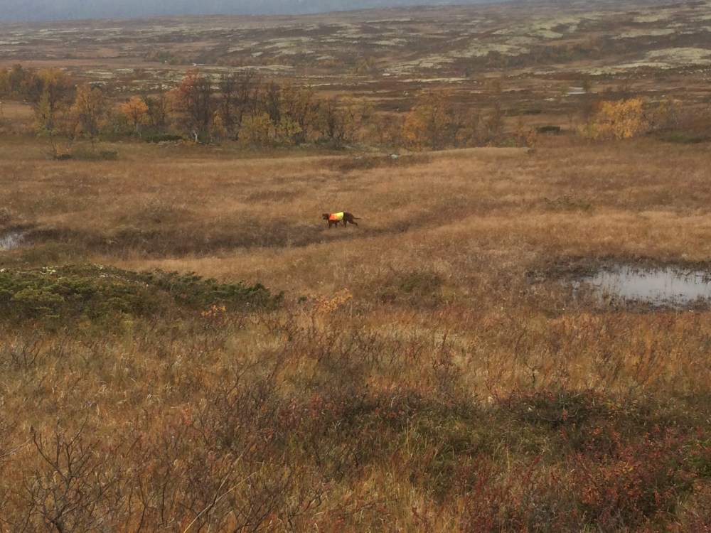 Etter dette fuglearbeidet skulle vi gå nesten hele dagen uten å se fugl, selv om hundene jobbet veldig godt. Da dagen nærmet seg slutten gikk Piri i ny stand. Nå felte pappa 1 fugl av de 15 som var i kullet. Et perfekt hundearbeid av en perfekt hund. Stella var borti fugl på ca. 500 meter, dette var 2 ryper som hadde en jagende rød flekk etter seg. Unghunden hadde våknet. Heldigvis kom hun ganske kjapt da jeg blåste henne inn.