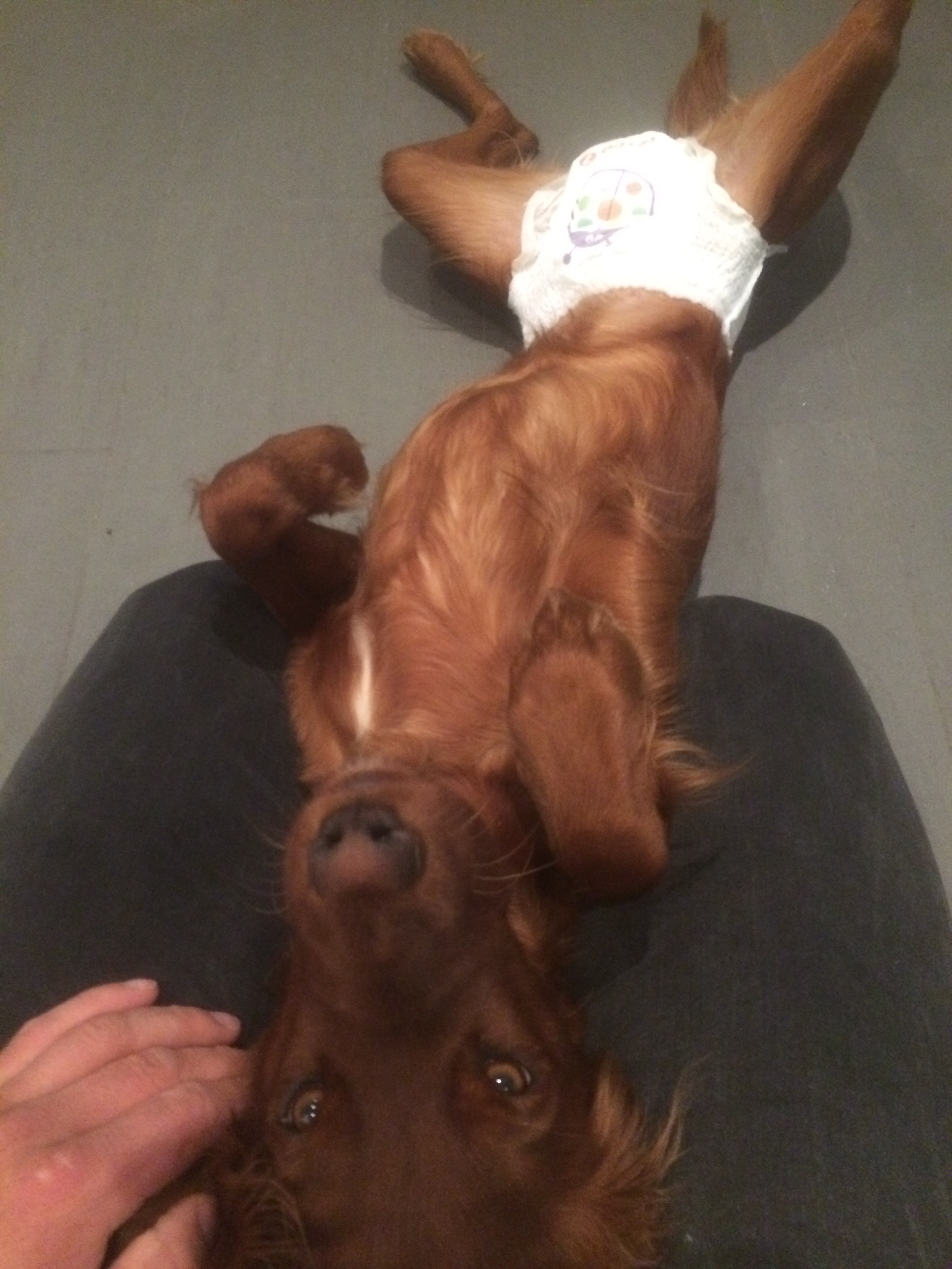 Synet som møtte meg da jeg kom hjem fra jobb. Var en hund i bleier, noe som kunne bare bety en ting. Stella hadde fått sin andre løpetid. Dermed får vi ikke stilt på helgas eller neste helgs jaktprøver til Østfold Fuglehundklubb. Jeg hadde gledet meg til disse helgene, men må bare smøre meg med tålmodighet. For første helga i november skal vi prøve oss på Fasan Cup. Norsk Irsk Setter klubbs klubbmesterskap for Oslo, Akershus og Østfold.