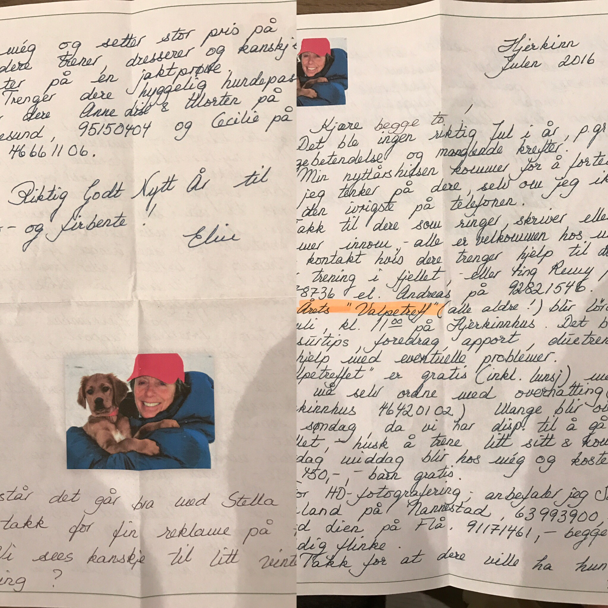 Da jeg kom hjem fra jobb i dag, lå det en konvolutt i postkassen. Jeg tok med det inn, som jeg pleier å gjøre med det som ligger i postkassen. Siden dette ikke var en vindukonvolutt var jeg ekstra nysgjerrig. Gleden ble derfor ekstra stor da jeg så en irsk setter på frimerket. Det kunne bety bare en ting. Brevet hadde tatt den lange veien fra Hjerkinn til Kråkerøy i Fredrikstad, hele 443 km og 5t30min i bil. Den eneste jeg kjenner som bor på Hjerkinn og har egne frimerker med den røde vakre hund, er min ungdommelige oppdretter og hundemor Elin Wittusen. Det at hun sender brev til sine valpekjøpere sier det meste om henne. Jeg har ikke hørt om andre oppdretter som gjør det. Ikke rart at hun er æresmedlem i Irsk Setter klubben. Elin er genuint opptatt av sine hunder, og jeg har lært mye av henne. Hun har en evne til å få alle, som er på Hjerkinn og Kennel US & camp, til å føle seg velkomne. Alle jeg har truffet og blitt kjent med hos Elin har vist seg å være veldig hyggelige mennesker. Det tror jeg Elin har æren for.