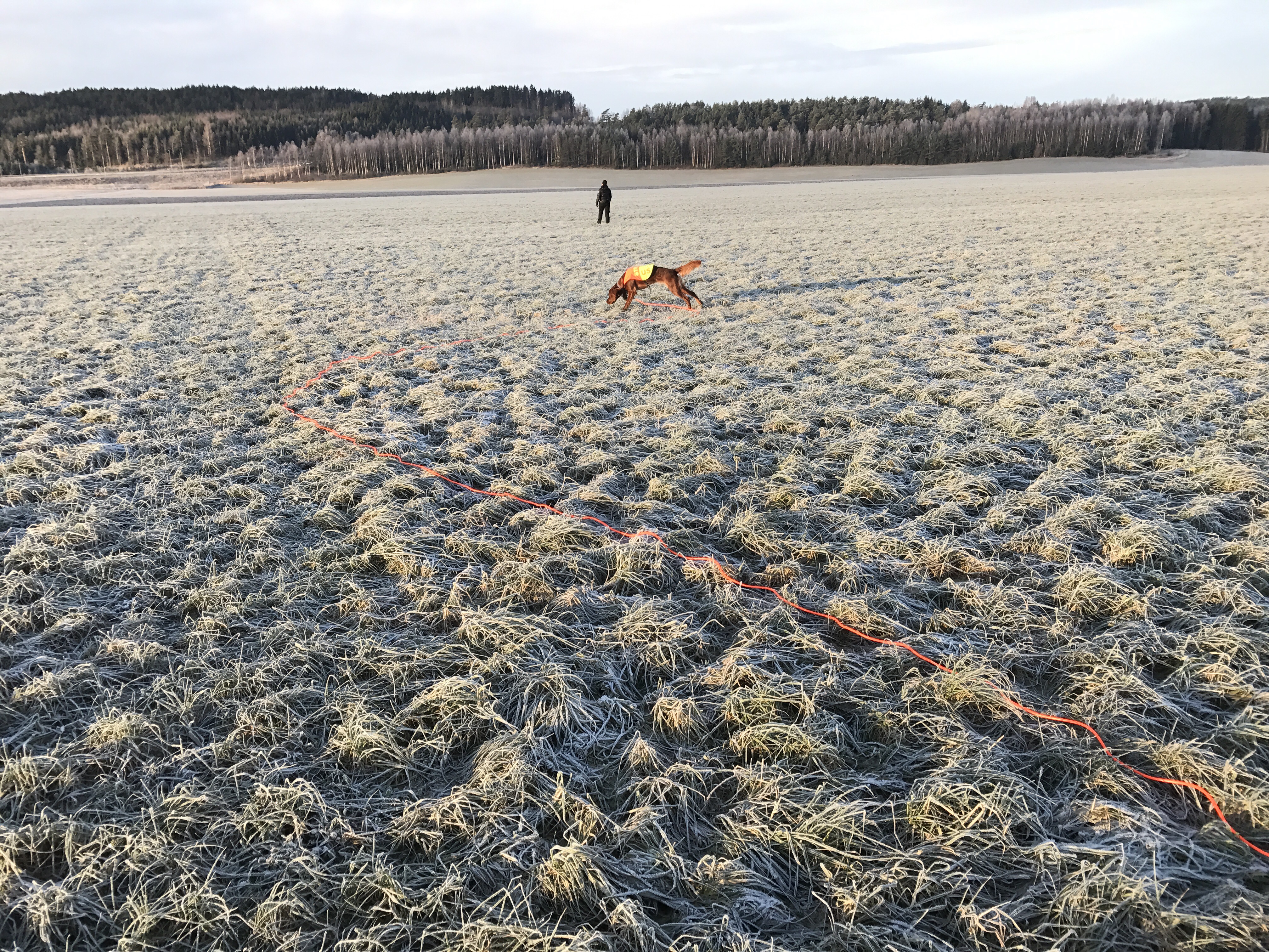 I dag hadde jeg med langline til Stella, i tilfelle hun kom i fugl. Det var dog ingen hunder på partiet mitt som gjorde det. Stella hadde ikke glemt gamle kunster og gikk veldig bra. Ekstra moro er det å se hvordan hun våkner opp når hun er sammen med andre fuglehunder. Går vi alene eller med andre raser er hun ikke like ivrig. Konkurranse instinktet hennes våkner ordentlig opp, og hun holder et bra tempo med god kontakt. Hun markerte noen steder, så det var tydelig at det hadde vært fugl der.
