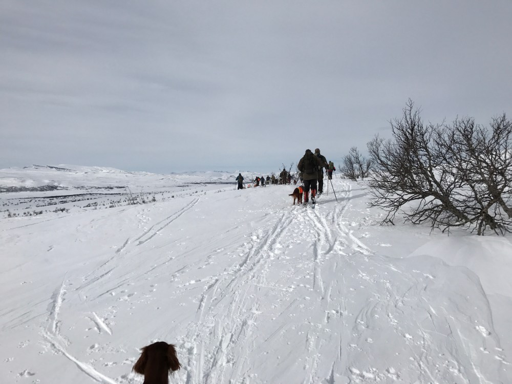 Lørdagen dro jeg avgårde med skikkelig godfølelse i magen. Til tross for at jeg hadde hatt mareritt om noen altfor svære ryper natten i forveien. Denne dagen hadde jeg kommet på parti med en som het Atri og hennes irske setter Bark. Hun ble jeg kjent med på Fasan Cupen til Norsk Irsk Setter klubb før jul. Med seg til Espedalen hadde hun tatt med seg sin nye kjæreste. I tillegg besto partiet av mange veldig hyggelige mennesker, med andre ord var det god stemning på fjellet. Mye latter og enda flere gode hunder.