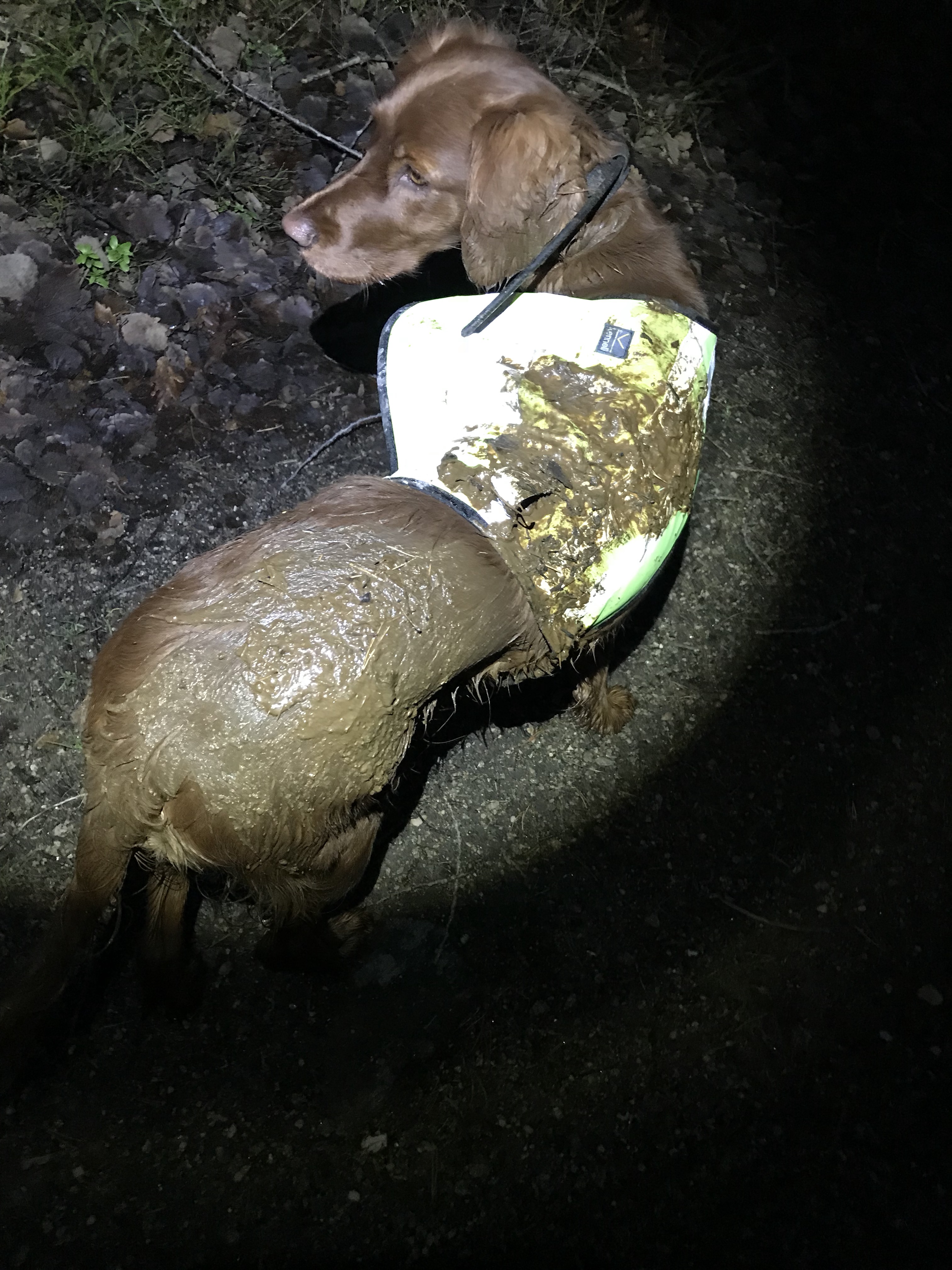 For da jeg kom hjem fra jobb skulle jeg gå en av de vanlige rundene mine. Siden det var tidlig mørkt hadde Stella på seg både refleksdekken og hundepeiler slik at jeg kunne følge bedre med på hvor hun var. Turen gikk blant annet gjennnom et hyttefelt her på Kråkerøy. Her skulle det vise seg at noen hadde hatt veldig løs mage og ikke rukket doen i tide. For Stella hadde nemlig funnet dette stedet og funnet det for godt å bade litt i avføringen. Stella hadde bare vært ute av synet i ett par sekunder, men det skulle vise seg å være nok. For da jeg fikk blåst henne inn, kjente jeg en lukt som fikk magesekken til å vrenge seg. Og da fikk jeg se det med mine egne øyne. Bikkja var totalt dekket i menneskebæsj.